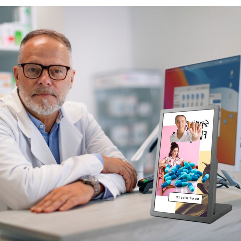 Ne bucuram sa avem un reach de peste 90% prin pozitionarea ecranelor intre pacient si farmacist la casa sau in spatele acestuia in campul vizual al pacientului.
